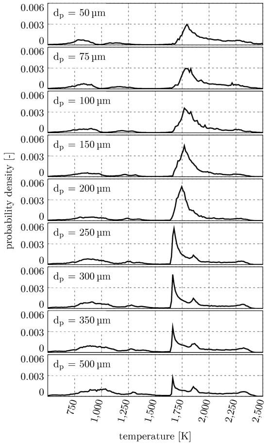 The most interesting region in the temperature distribution is the region between 1600 K and 2500 K. This region shows the most common temperatures the particles encounter, which influences their conversion degree. The most common temperature that is encountered by the particles decreases with increasing diameter. The smaller particles with (diameters < 250 ) have peaks at or above 1750 K. The larger particles are more likely to encounter lower temperatures and the peak is at 1650 K. Due to the similar trajectories of the larger particles (diameters ≥ 250 ) these particles encounter very similar temperatures. The effect that smaller particles travel through regions of higher temperature in combination with the larger specific surface area lead to an even faster conversion of the small particles compared to the larger particles.