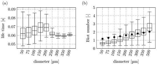 In Figure 9b the Biot number () distribution for each particle diameter is shown. The black dot in the box plot represents the Biot number that was calculated using the initial conditions around the particle at the point of injection. The figure shows that the Biot number estimated for the particles at injection is not necessarily representative of the median Biot number of the particles inside the RW zone. For small particles the initial Biot number is overestimated, and for larger particles, it is underestimated. All particles can be seen to be in the thermally thick regime ( [48]). However, the smallest radii show Biot numbers consistently below 1, which results in only small internal temperature gradients when compared to the larger particles. Larger temperature gradients for larger particles lead to an increase in the variation around the median value of the Biot numbers seen in Figure 9b with increasing particle diameters.