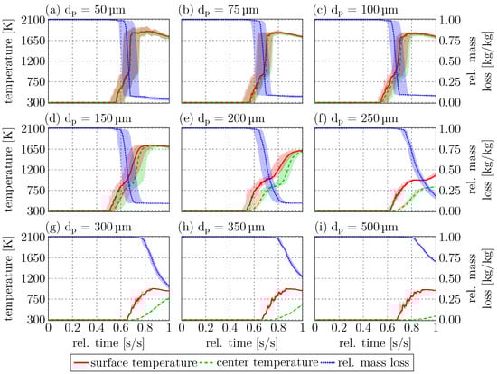 This is in line with Figure 7 and Figure 8, where the smaller particles sample more diverse paths through the RW, leading to larger differences between the individual particles. Up to particle diameters of 200 , the median particle surface temperatures reach a maximum of approximately 1600 K to 1800 K, the center temperatures are only slightly smaller than the surface temperatures, and the particles are almost isothermal. In general, these particles have enough time in the RW zone for (almost) complete thermochemical conversion, as can be seen in the median mass loss curve. For particle diameters of 250 and above, the particle center does not heat up to the same temperature as the particle surface. The maximum surface temperature for these particles is between 900 K and 1100 K, while the maximum center temperatures are between 400 K and 800 K. These particles mostly show non-isothermal behavior and do not spend enough time in the RW for complete heat-up. However, the temperatures at the particle surface are sufficient for pyrolysis, leading to relative mass losses between 80% for 250 particles and 30% for 500 particles.