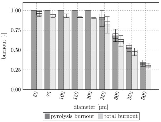Pyrolysis burnout (left bar) and total burnout (right bar) at the time of removal from the simulation for each particle diameter. For diameters above 250 no complete pyrolysis is observed and the total burnout decreases drastically.