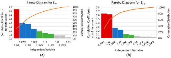 Five Pareto diagrams illustrating the diversified magnitude of the correlations between ten independent variables and five dependent variables, (a) Etot, (b) Esol, (c) m = r, (d) v and (e) h, defining the developed parametric thermal model.
