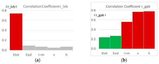 In the second diagram, shown in Figure 6b, we can see that the correlations between two independent variables, p_ws and g_sz, and Esol are very strong because the values of their coefficients are greater than 0.6. The big inclination of the starting fragment of the segment line points to a very strong magnitude of correlations between the first two variables and the thermal performance of the passive buildings. Therefore, we are able to deduce that the amount of solar energy Esol delivered to the interior can be decisively influenced by the properties of the windows and the width of the buffer space. The strength of the correlations between g_pb or g_al and Esol is temperate. The infiltration, ventilation and roof slope seem to have a relatively small impact on Esol. The correlations between four variables, g_ot, g_tp, g_wb and p_wb, and Esol can be negligible.