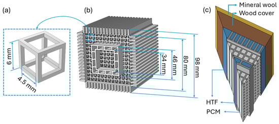 In a recent study, an LHTES mock-up was developed and fabricated using laser powder bed fusion (L-PBF) from AlSi10Mg aluminium alloy powder and subsequently infiltrated with paraffin wax (RT70HC, Rubitherm) (see ref. [22]). The high thermal conductivity of the metal lattice was leveraged to homogenize the temperature distribution within the PCM and simultaneously reduce its melting and solidification times. The lattice was also designed to function as a heat exchanger between the heat transfer fluid (HTF) and the LHTES system. The metal structure had a cubic form (80 mm × 80 mm × 80 mm) and featured an internal 3D Cartesian lattice composed of repeated hollow cubic elements with 6 mm sides (Figure 1a). HTF flowed through an inner duct (34 mm inner, 46 mm outer side) and across external fins (3 mm thick, 9 mm long) integrated into the device. The device was enclosed in a wooden casing to guide the HTF over the external fins. To enhance thermal insulation from the environment, the prototype was covered with a layer of mineral wool (see Figure 1). The aluminium structure had the mass of approximately 630 g.