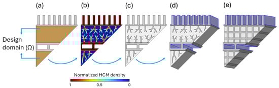 The topology optimization process begins with an initial 2D design guess (Figure 2a), onto which the boundary conditions are imposed. The resulting optimized fin geometry is then extruded to construct the 3D model to evaluate the LHTES device (Figure 2d). The topology-optimized fins were designed with a volume fraction constraint to ensure that the final structure contained the same volume of highly conductive material (HCM) and PCM as the original design.