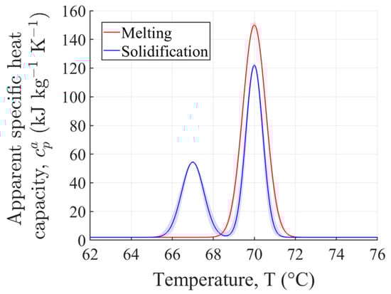 Material-dependent coefficients of Equation (8) for the apparent specific heat capacity () of paraffin RT70HC during the fusion and solidification processes. The table is adapted from ref. [22].
