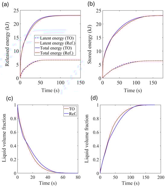 Performance comparison between the simplified reference model and the topology-optimized (TO) model: (a) Thermal energy released, (b) Thermal energy stored and liquid volume fraction of the PCM during (c) discharging and (d) charging.