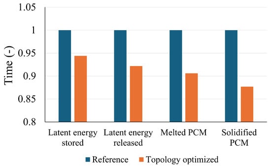 Simplified models of both the reference and topology-optimized LHTES systems were evaluated under identical thermal conditions. Figure 4a,b show the released and stored energy for the simplified reference model and the topology-optimized model, respectively. At intermediate stages of both the charging and discharging processes, the optimized model exhibits superior performance, with greater absorption and release of both total and latent energy. A key parameter that characterizes the performance of the device is the time required to store or release 90% of the available latent heat, referred to as . Lower values indicate a faster thermal response of the LHTES unit. Compared to the reference model, the optimized device demonstrated improvements of 5.6% and 7.6% in for the charging and discharging processes, respectively. Another interesting observation is presented in Figure 4c, which highlights a significant improvement in PCM solidification during the discharging process. In the optimized storage device, 90% of the PCM solidifies in 30.6 s, compared to 34.9 s in the reference case, indicating a 12.3% improvement. However, during the charging process (Figure 4d), the improvement in the melted fraction of the PCM is slightly lower, at 9.4%. For better visualization, Figure 5 summarizes the values and also the time required for 90% of the PCM to melt or solidify during the charging and discharging processes.