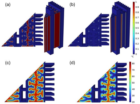 Figure 6c,d illustrate the temperature distribution within the optimized LHTES device at t = 15 s and t = 30 s, respectively. At t = 15 s (Figure 6c), the temperature gradients indicate that heat is being effectively conducted away from the LHTES device, initiating solidification in regions near the branches. By t = 30 s (Figure 6d), the extent of high-temperature zones has significantly diminished, particularly near the branches. However, isolated pockets of elevated temperature persist, primarily in regions farther from the branches, indicating the presence of residual liquid PCM, more clearly visible in Figure 6b. These localized hotspots are the result of slower cooling and delayed phase-change in thermally isolated zones. Quantitatively, temperature deviations of up to C were recorded between the hotspot regions and the volume-averaged PCM temperature at t = 30 s.