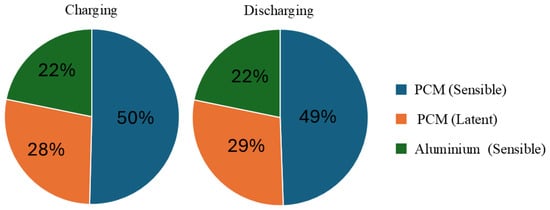 The total energy (E) and latent energy (L) absorbed and released during the charging and discharging processes, as calculated from Equations (10) and (11), are presented in Figure 7. Nearly 30% of the total energy stored and released by the system is attributed to latent heat, highlighting the significant role of phase-change materials in energy storage. In contrast, the sensible heat stored by the aluminium matrix accounts for 22% of the total energy. Furthermore, the large share of sensible heat stored within the PCM—approximately 50%—demonstrates that, even outside the phase-change region, the PCM plays a major role in the system’s thermal inertia. This distribution highlights the advantage of combining latent and sensible heat storage mechanisms, allowing the system to store substantial energy quantities without necessitating higher HTF temperatures. Increasing the HTF temperature would boost the sensible heat contribution, thereby increasing the overall energy stored. However, this would also lead to higher thermal losses during the storage period, potentially reducing the net energy efficiency of the system. Additionally, the nearly equal energy shares observed during charging and discharging confirm that the system operates in a balanced manner.