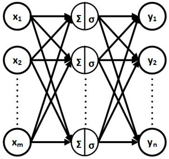 The power distribution network has been modeled on the phase level, where a neural network has been defined individually for each phase to derive the relationship between voltage and nodal power injection. The adopted neural network model is shown in Figure 1. The network contains one input layer, one hidden layer, and one output layer. The number of neurons in the input and output layers depends on the number of inputs and outputs, i.e., m and n, respectively, whereas the number of neurons in the hidden layer is defined by the user. The activation function chosen for the hidden layer is the sigmoid function (σ) shown in (1).