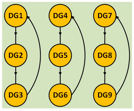 Although there are various possible communication topologies when considering the information flow direction and nature of interaction between DGs, a unidirectional intra-phase DG communication has been assumed for this study, as shown in Figure 2. This communication topology is called Unidirectional Individual Cooperative Control (UDICC). In the figure, DG1–DG3 belong to phase A, whereas DG4–DG6 and DG7–DG9 belong to phase B and C, respectively. In this study, selected non-DG nodes are communicating with each of the DG nodes.