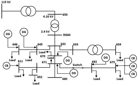 This study was performed for a modified 13-bus system shown in Figure 3. The system contains nine DGs that include three single-phase DGs on buses 670 and 671 and one single-phase DG on buses 645, 646, and 692. The DGs considered in this study are assumed to be single-phase elements to address the phase voltage imbalance.