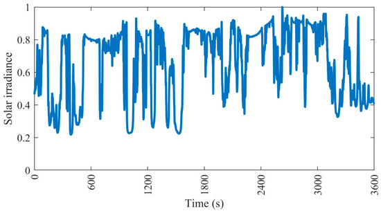 This study horizon is one hour, i.e., 3600 s. The solar PVs connected to the distribution system are rated at 300 kW each and follow the second-based irradiance profile, scaled between 0 and 1, as shown in Figure 4. The irradiance profile displaying significant fluctuations within an hour was chosen from the irradiance data released by the National Renewable Energy Laboratory (NREL) [33].