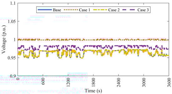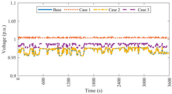 Figure 6 shows the voltage profile for all three cases at phase A of bus 692, i.e., node 692.1. It can be observed that the best optimal voltage profile is obtained for case 1, as utilization of inverter reactive power is not intentionally restricted apart from rating limits. The voltage profile for case 2 aligns with the base voltage profile due to intentionally limiting the inverter reactive power utilization to zero. The voltage profile for case 3 is better than case 2 but is inferior to case 1 due to the objective trade-off between voltage deviation and reactive power utilization.