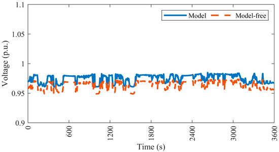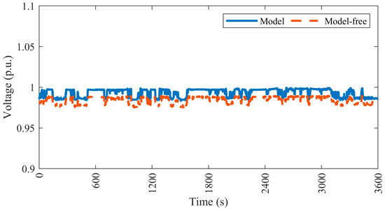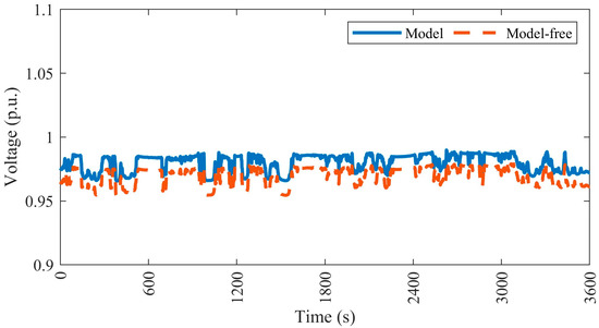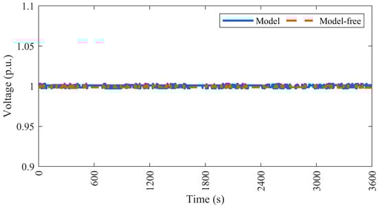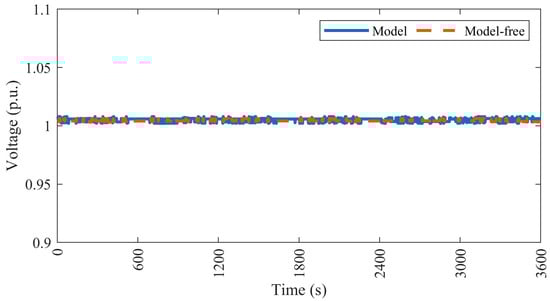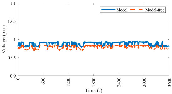 Figure 10 and Figure 11 show the voltage profiles obtained for case 2, where the emphasis is on minimizing the supply/consumption of reactive power, leading to minimal voltage regulation. It can be observed that the voltage profiles for model-free and model-based approaches exhibit similarity with minor deviations observed across the time horizon.