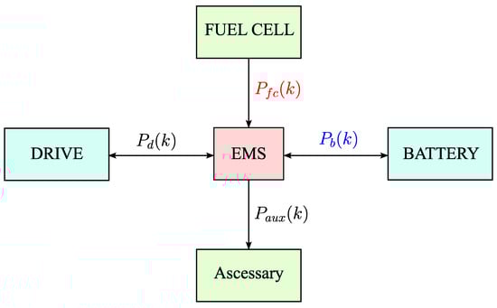 For the purposes of this study, the fuel cell/battery electric vehicle is, without loss of generality and within a discrete-time aspect, briefly represented by the power-flow block diagram shown in Figure 1. The drive block denotes the required power [kW] at sampling index k, as determined by the vehicle velocity , physical resistances, and longitudinal dynamics.