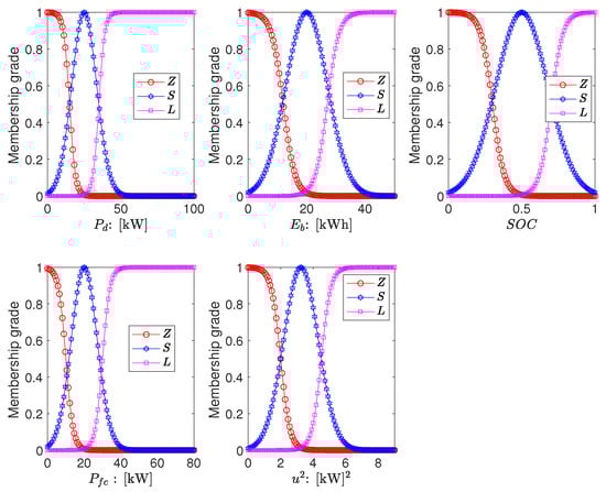 To implement the proposed scheme, the membership functions for all inputs of both MiFRENm and MiFRENs, as illustrated in Figure 5, are designed in accordance with the constraints specified in Equation (6) and Table 2. It is worth noting that, for comparative purposes, the battery power [kW] is reformulated as the stored energy within the battery, [kWh], defined as