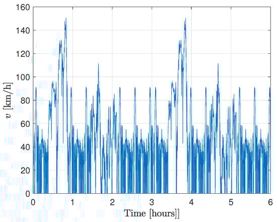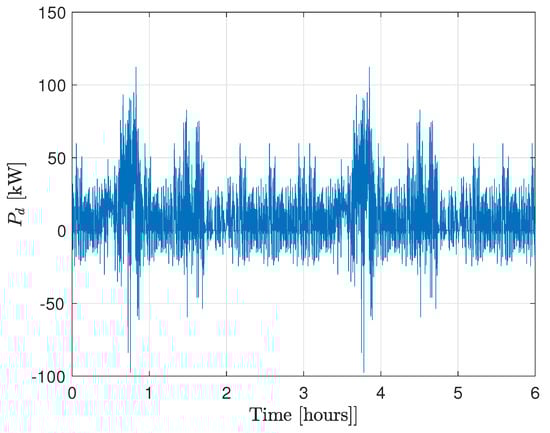 The velocity trajectory shown in Figure 6 is constructed by sequentially combining standard driving cycles, including UDDS, HWFET, ArtMw150, FTP, ArtRoad, and WLTP2 [,,,]. These datasets are recorded with a sampling interval of 1 [s]; thus, the sampling time is defined as [s]. Based on the selected velocity profiles and corresponding road conditions, the resulting power demand trajectory is computed and illustrated in Figure 7.