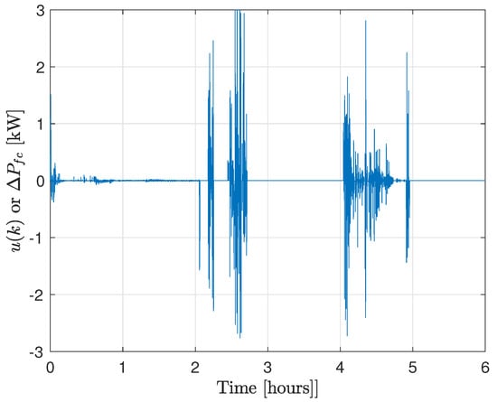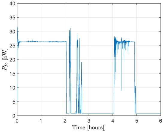 As a result, the power output generated by Controller B is illustrated in Figure 16. In comparison with Controller A, it is evident that the high-frequency components have been significantly suppressed, indicating smoother fuel cell operation. However, some transient variations are observed during the initial hour of operation, likely due to the adaptation period of the learning-based controller. Furthermore, Figure 17 presents the evolution of under Controller B. While the state of charge is successfully maintained within the specified operational limits, the trajectory exhibits slightly larger oscillations compared to those obtained with the proposed controller and Controller A.