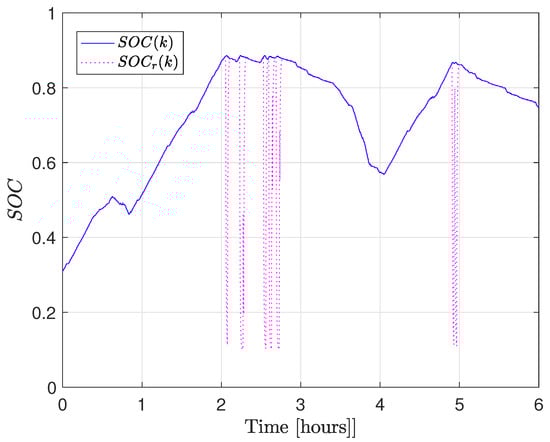 At this stage, the control input must be designed to drive the system output in Equation (11) to follow the desired trajectory . In this work, corresponds to the reference state-of-charge denoted as , such that