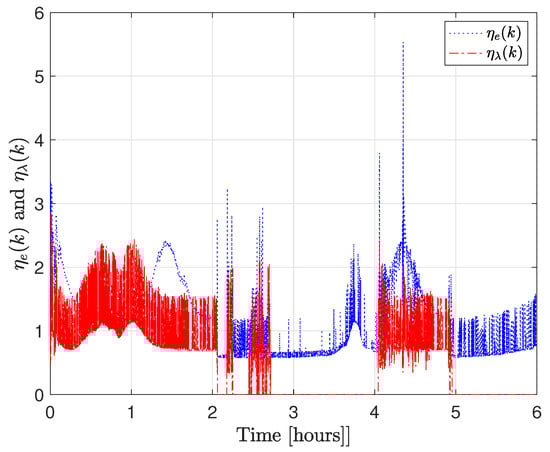 Under the proposed controller, the time-varying behavior of the fuel cell power is shown in Figure 8, with the corresponding control effort , represented as , illustrated in Figure 9. The results indicate that the controller successfully maintains the fuel cell power output at a nearly constant level for the majority of the operation period, while strictly adhering to the lower and upper power constraints defined in Table 2. The battery energy evolution , shown in Figure 10, reveals that despite starting from a low initial energy level, the controller is able to sustain an adequate battery charge throughout the drive cycle. Furthermore, Figure 11 compares the actual state of charge with the reference trajectory , demonstrating accurate tracking performance under varying operational conditions. To highlight the adaptive behavior of the proposed networks, Figure 12 illustrates the evolution of the time-varying learning rates and , which govern the online adaptation of MiFRENm and MiFRENs, respectively. Nonetheless, it is worth remarking that the fluctuations observed in the reference state of charge are closely associated with variations in the co-state learning rate , as illustrated in Figure 12. This correlation highlights the effectiveness of the proposed scheme, wherein the adaptive learning mechanism enables the controller to accurately manage the behavior of the actual —particularly under high charge conditions. These learning rates dynamically respond to system variations, contributing to the robustness and real-time adaptability of the control strategy.