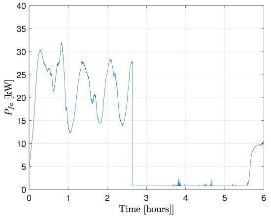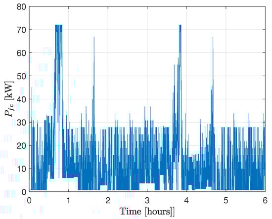 With respect to a quasi-static fuel cell model, [kW] denotes the power output at sampling index k, which reflects the instantaneous hydrogen consumption, expressed as , where is a generally nonlinear function considered unknown in this work. In light of this relationship, and consistent with insights from related studies, the EMS design in this work is directly based on the principle that a reduction in the required power leads to a corresponding decrease in hydrogen consumption.