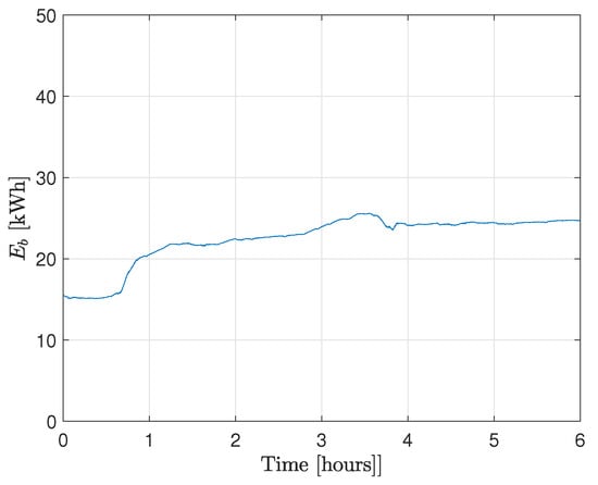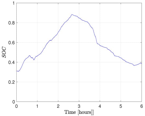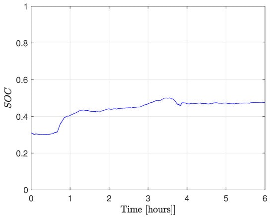 In this case, the fuel cell power output under Controller A is depicted in Figure 13. In comparison with the results obtained using the proposed controller (Figure 8), it is apparent that Controller A induces more pronounced high-frequency fluctuations in . This behavior may impose additional stress on the fuel cell system and could potentially reduce its operational lifespan. Figure 14 presents the battery energy trajectory , indicating that the controller maintains the battery around its nominal energy level throughout the driving cycle. Additionally, Figure 15 shows the evolution of the state of charge , demonstrating that Controller A achieves its design objective of regulating near a constant value. Nonetheless, it is important to note that this approach may sacrifice smooth fuel cell operation in favor of maintaining a steady battery charge.