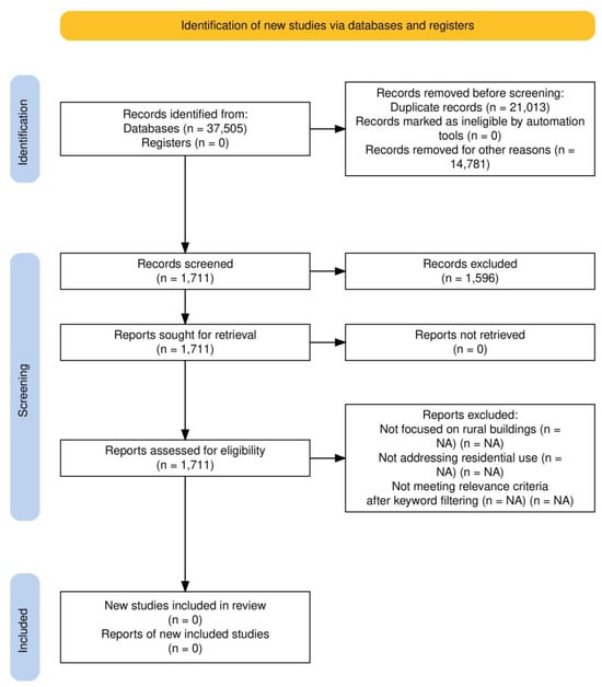Following Preferred Reporting Items for Systematic reviews and Meta-Analyses (PRISMA) guidelines [], the authors selected keywords based on terms commonly used in similar reviews. This study aims to address a gap in existing research by linking rural farmhouse rehabilitation to landscape issues, often neglected in previous analyses. This approach aligns with the theoretical framework outlined in the Background section and with the study’s core hypothesis, which considers agricultural buildings as inseparably connected to the surrounding landscape and shaped by its specific influence.