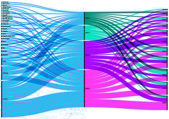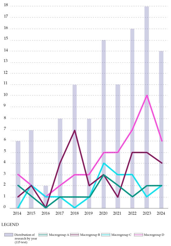 This is further confirmed by another finding: the interest expressed by authors from various countries over the past decade highlights the scientific community’s growing focus on the themes addressed in macro-groups A and D. This trend is illustrated in Figure 2 below.