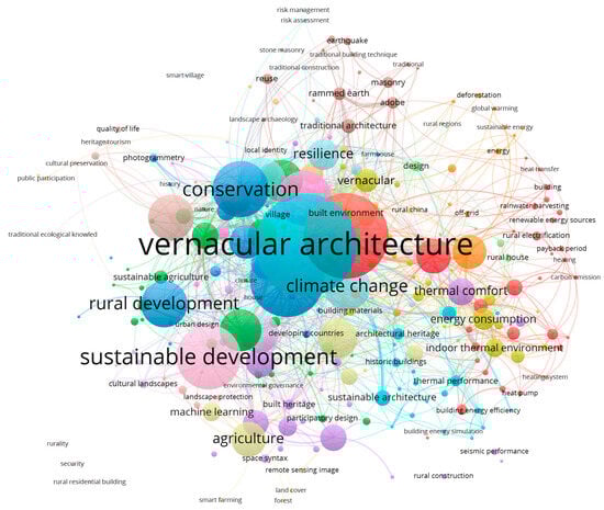 The keyword co-occurrence maps generated with VOSviewer 1.6.20 for macOS—based on separate datasets from Scopus (Figure 3) and Web of Science (Figure 4)—provide a detailed overview of the main thematic trends in international literature on rural architecture rehabilitation and retrofitting.