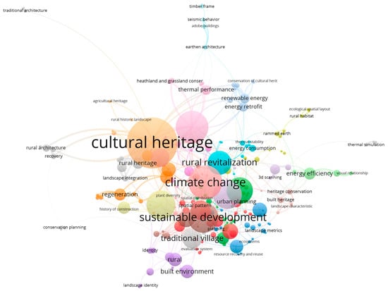 It is important to highlight that terms like “Rural Landscape” and “Spatial Pattern” (five occurrences each), along with “Cultural Heritage”,” Sustainable Architecture”, “Traditional Settlement”, and “Vernacular” (four occurrences each), clearly reflect the connection between vernacular heritage and the cultural landscape. Their presence highlights the need for design strategies that protect local identity without changing original forms. In contrast, the lower frequency of energy-related terms like “Passive Design”, “Energy Consumption”, and “Sustainable Design Principles” (2) suggests that energy retrofitting is still less developed and needs more research and practical focus. This confirms the timeliness and relevance of the present review, which precisely seeks to fill this critical gap, placing at the center of reflection the need for eco-conscious upgrading practices that respect cultural and landscape heritage.