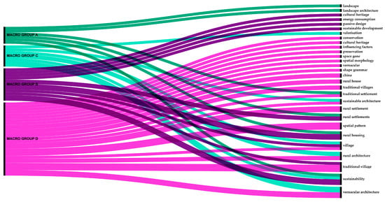 Alluvial diagram of keywords related to the three macro groups and the keywords—© authors, 2025.