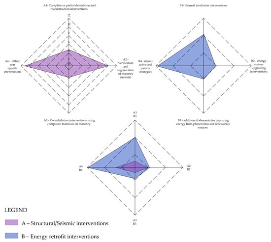 This confirms how issues related to the retrofitting of rural buildings, both from a structural and an energy perspective, find a point of convergence in the balanced attention devoted to both upgrading practices and morpho-typological aspects. These findings align with the theoretical framework of the study, which emphasizes the need for rehabilitation strategies that upgrade existing buildings while respecting the morphological features of agricultural architecture.