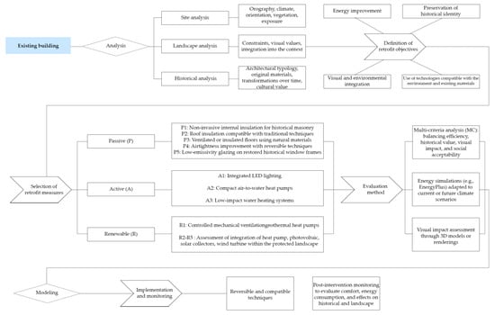 To be effective and aligned with protection and enhancement goals, energy retrofitting must follow a design process based on a deep understanding of the building’s historical, typological, and landscape characteristics, as well as its context []. Otherwise, there would be a risk of interventions which, while improving energy or functional performance, would irreversibly compromise the identity of the places, even to the point of undermining the expressive value of the landscape [].
