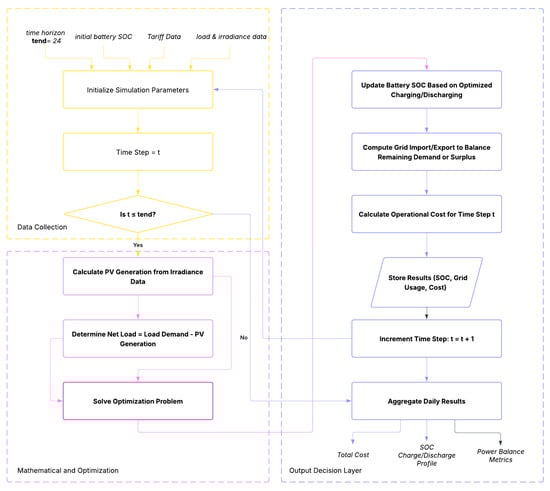 This section presents the algorithm developed for the techno-economic management of a residential microgrid comprising a 25 kW solar photovoltaic (PV) system, a 21 kWh battery energy storage system (BESS), and grid interconnection supplying six townhouses. The proposed algorithm aims to minimize the total operational cost while satisfying the load demand and adhering to system constraints. The algorithm is implemented in MATLAB Simulink and integrates PV generation forecasts, load profiles, battery storage dynamics, and grid transactions.