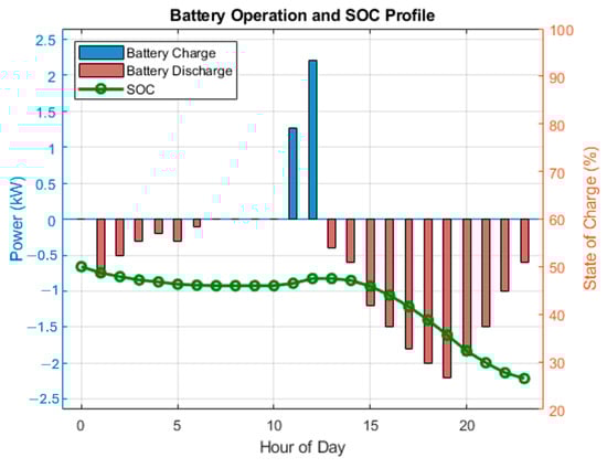 The results demonstrate that integrating a 25 kW PV system and a 21 kWh battery system into the residential microgrid can reduce daily operational costs by approximately 40% compared to a baseline scenario without renewable integration. This reduction primarily stems from the system’s ability to shift loads from high-tariff grid periods to periods with lower costs or to utilize self-generated renewable energy. This finding aligns with previous studies that highlight the economic viability of PV–battery hybrid systems for residential applications [17].