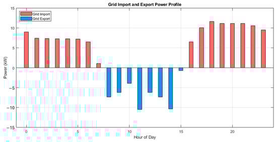 Figure 3 depicts the hourly grid import and export power. Grid import occurs during periods when PV generation and battery discharge are insufficient to meet the load, primarily during early morning and late evening. Grid export occurs when PV generation exceeds both the load demand and the battery’s charging capacity. These dynamics highlight the microgrid’s potential to provide peak shaving and valley filling services to the main grid.