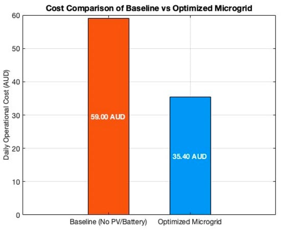 The techno-economic optimization results in a daily operational cost of A$ 35.40, representing the net cost of energy imports offset by any export credits. Figure 4 compares the cost profile of the optimized microgrid operation to a baseline scenario without PV or battery integration. The optimized configuration demonstrates a 40% reduction in daily operational costs, validating the economic viability of integrating renewable energy and storage resources.
