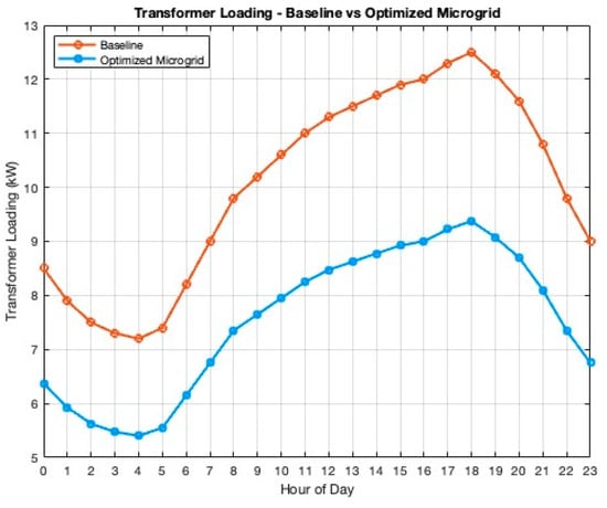 Figure 5 compares the transformer loading profile under the baseline scenario and the optimized microgrid operation. The optimized scenario achieves a peak load reduction of approximately 25% relative to the baseline, indicating the potential for transformer life extension and deferred infrastructure investments.