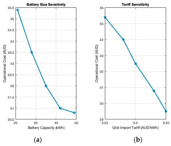 Operational cost sensitivity analysis. (a) Operational costs involved in using the battery in usable kWh; (b) operational cost involved with entire DER compared to cost of buying energy from grid.