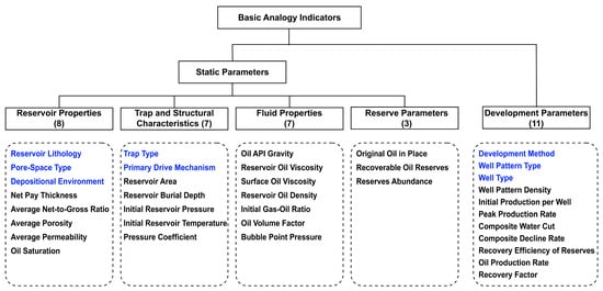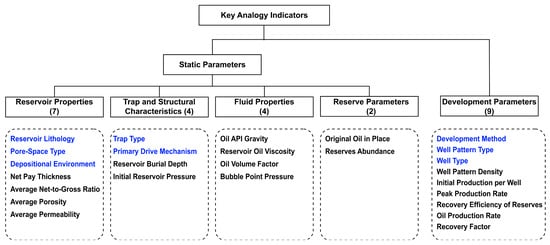 A total of 36 basic analogy indicators were initially chosen, covering both static and development parameters. The static parameters include reservoir properties, trap and structural characteristics, fluid properties, and reserve parameters. Among these, eight are qualitative indicators (highlighted in blue), and twenty-eight are quantitative indicators (shown in black), as shown in Figure 2.