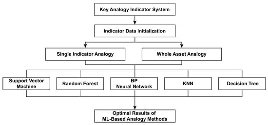 In oilfield development projects, analogy involves selecting similar reference projects to evaluate a new development project through comparison and inference, thereby enabling rapid screening and evaluation. In this study, two analogy approaches are employed: (1) single indicator analogy, which supplies reference values for missing indicators in the target asset, and (2) whole asset analogy, which qualitatively evaluates the overall potential and value of the target project. Both approaches are implemented using five machine-learning algorithms: support vector machine (SVM), random forest (RF), backpropagation neural network (BP), k-nearest neighbor (KNN), and decision tree (DT). The workflow of the analogy method is shown in Figure 4.