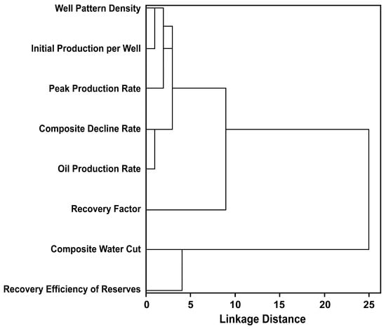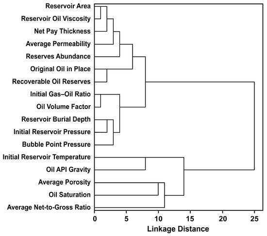 These classification results align with the engineering significance of oilfield attributes. Static parameters were divided into nine categories: Reservoir Burial Depth, Initial Reservoir Pressure, and Initial Reservoir Temperature form one group, reflecting the subsurface pressure–temperature conditions that govern drive energy. Initial Gas–Oil Ratio, Oil Volume Factor, and Bubble Point Pressure form another group, indicating how fluid phase behavior and volumetric expansion potential control recovery efficiency. Reservoir Area, Original Oil in Place, and Recoverable Oil Reserves form a group, highlighting the volumetric capacity that underpins overall field value; Average Permeability, Reservoir Oil Viscosity, and Oil API Gravity group together, capturing the combined effects of reservoir permeability and fluid mobility on deliverability. Development parameters were divided into six categories: Well Pattern Density and Composite Water Cut form a group, characterizing development intensity and waterflooding performance. Recovery Factor and Oil Production Rate form another group, illustrating overall production capacity. The remaining indicators each form individual groups, underscoring their independent value in evaluation.