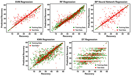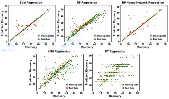 Figure 11 presents predicted versus actual recovery values for each method. Green points denote training-data predictions, and red points denote test-data predictions. In the SVM plot, both green and red points cluster tightly along the 45° line, indicating an excellent fit on the training data and strong generalization to unseen cases. RF also aligns densely around the diagonal, although test-data points show slightly greater scatter, indicating robust performance with limited variance. By contrast, the BP neural network achieves a near-perfect fit on the training data but exhibits marked dispersion on the test data, signaling mild overfitting. KNN yields a broadly dispersed point cloud for both sets, revealing underfitting due to its local-averaging nature. Finally, DT displays a staircase pattern in the training data, characteristic of overfitting, and notable scatter in the test data, reflecting poor generalization. These observations confirm that only support vector machine and random forest achieve an optimal balance between bias and variance that meets engineering requirements.