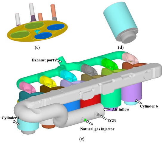 Three-dimensional model of the natural gas engine: (a) Exhaust ports. (b) Intake ports. (c) Cylinder head, spark plug, and valves. (d) Piston and cylinder. (e) Overall structure of engine model.
