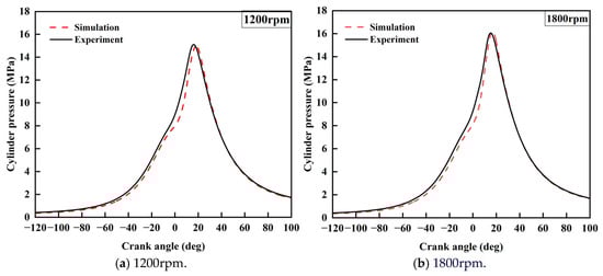 Due to the inherent characteristics of premixed NG engines, from the experimental date, it can be seen that there are significant differences in combustion among the cylinders. Furthermore, due to theoretical assumptions in simulation and measurement errors in experimentation, it is impossible to ensure completely matching simulation data with experimental data across all six cylinders. Therefore, this study selected the average in-cylinder pressure of the six cylinders for simulation and experimental validation, as shown in Figure 3. It can be observed that, under the calculated operating conditions, the in-cylinder pressure data from the simulation model matched well with the experimental data, with peak pressure errors and peak phase errors within 5% for both operating conditions at 1200 rpm and 1800 rpm. The validation demonstrates the reliability of the simulation platform established in this study, which could provide support for subsequent simulation research.
