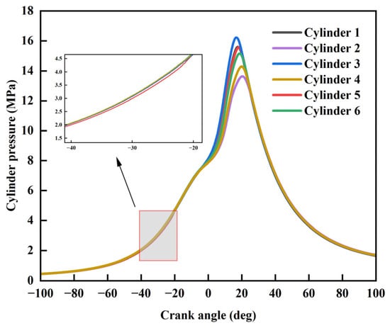 Comparison of in-cylinder pressure curves among 6 cylinders.