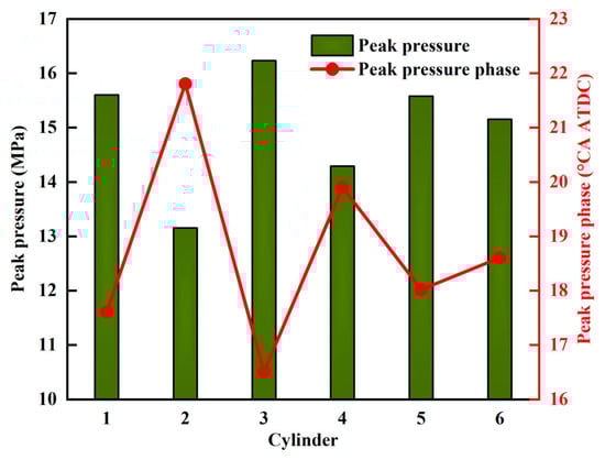 Figure 4 compares the in-cylinder pressure curves of the six cylinders. Figure 5 compares the peak pressures and the peak phases of the six cylinders. As shown in the figures, before the ignition timing of 20 °CA BTDC, the pressure values of each cylinder have minor differences during the intake and compression strokes. However, during the combustion process from 20 °CA BTDC to 40 °CA ATDC, the cylinder pressures differ significantly. Cylinder 3 has the highest peak cylinder pressure of 16.3 MPa and the earliest peak phase of 16.5 °CA ATDC, while cylinder 2 shows a significant decrease in peak cylinder pressure to 13.2 MPa, and a delayed combustion, with the peak phase of 21.8 °CA ATDC. The difference rate in peak pressure between cylinder 3 and cylinder 2 is as high as 23.5%, and the difference rate in peak phase is as high as 24.3%.