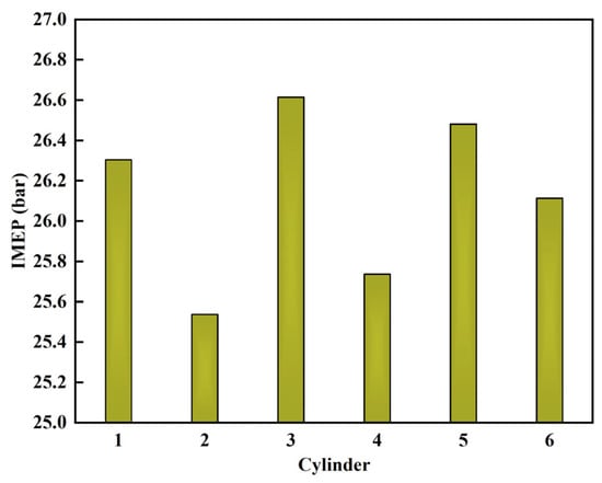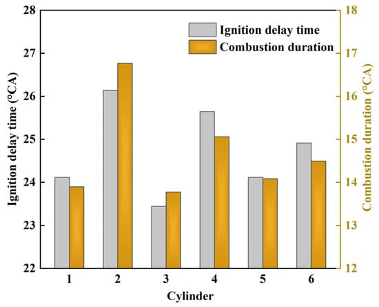 Figure 6 and Figure 7 compare the ignition delay time (IDT), combustion duration (CD), and indicated mean effective pressure (IMEP) among cylinders. IDT refers to the crank angle interval from the ignition timing to CA10; CA10 denotes the crank angle at which 10% of the cumulative heat release has been achieved. CD represents the crank angle interval from CA10 to CA90; CA90 indicates the crank angle at which 90% of the cumulative heat release has been reached. It can be observed that cylinder 3 had the shortest IDT and CD, indicating the fastest combustion speed and the best power performance, and the IMEP of cylinder 3 was up to 26.62 bar. In contrast, cylinder 2 had the longest IDT and CD, indicating the slowest combustion speed and the worst power performance, and the IMEP of cylinder 2 was 25.54 bar. The difference rate of IMEP between cylinder 3 and 2 was 4.23%. The variation trends of the combustion phase and IMEP between different cylinders are in correspondence with the cylinder pressure variation trends.