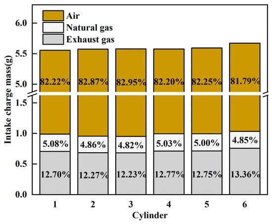 The above section presents the primary analysis of the power performance and combustion process among the six cylinders, which could obviously reveal the existence of CTCV. The following section will further quantify the main boundary conditions among the cylinders to better understand the details of these variations within the power performance and combustion process. Figure 8 compares the intake charge mass per cycle and the proportion of the intake composition among the six cylinders. It can be observed that the greatest difference in intake charge mass is between cylinder 1 and cylinder 6, which are located on opposite sides of the intake manifold. The intake charge of cylinder 1 is 5.56 g per cycle, while that of cylinder 6 is 5.63 g per cycle; the difference rate is about 1.3% relative to cylinder 1. The reason why cylinder 6 has a higher intake charge compared to the other cylinders is that cylinder 6 is the farthest from the inlet and, thus, is most affected by the pressure fluctuations within the intake port. The intake charge entering the cylinders is composed of air, natural gas, and exhaust gas. For these three components, the unevenness of air among the cylinders is primarily due to uneven distribution, while the unevenness of NG and exhaust gas (injected at a single point in the intake manifold) among the cylinders is the combined effect of uneven mixing and uneven distribution. The maximum and minimum proportions of air were 82.95% for cylinder 3 and 81.79% for cylinder 6, respectively, with a maximum difference rate of 1.4% relative to cylinder 6. The maximum and minimum proportions of NG were 5.08% for cylinder 1 and 4.82% for cylinder 3, respectively, with a maximum difference rate of 5.4% relative to cylinder 3. The maximum and minimum proportions of exhaust gas were 12.23% for cylinder 3 and 13.36% for cylinder 6, respectively, with a maximum difference rate of 9.2% relative to cylinder 3. Although the NG and exhaust gas had relatively small proportions of the intake charge, the degree of variation between the cylinders is relatively large.